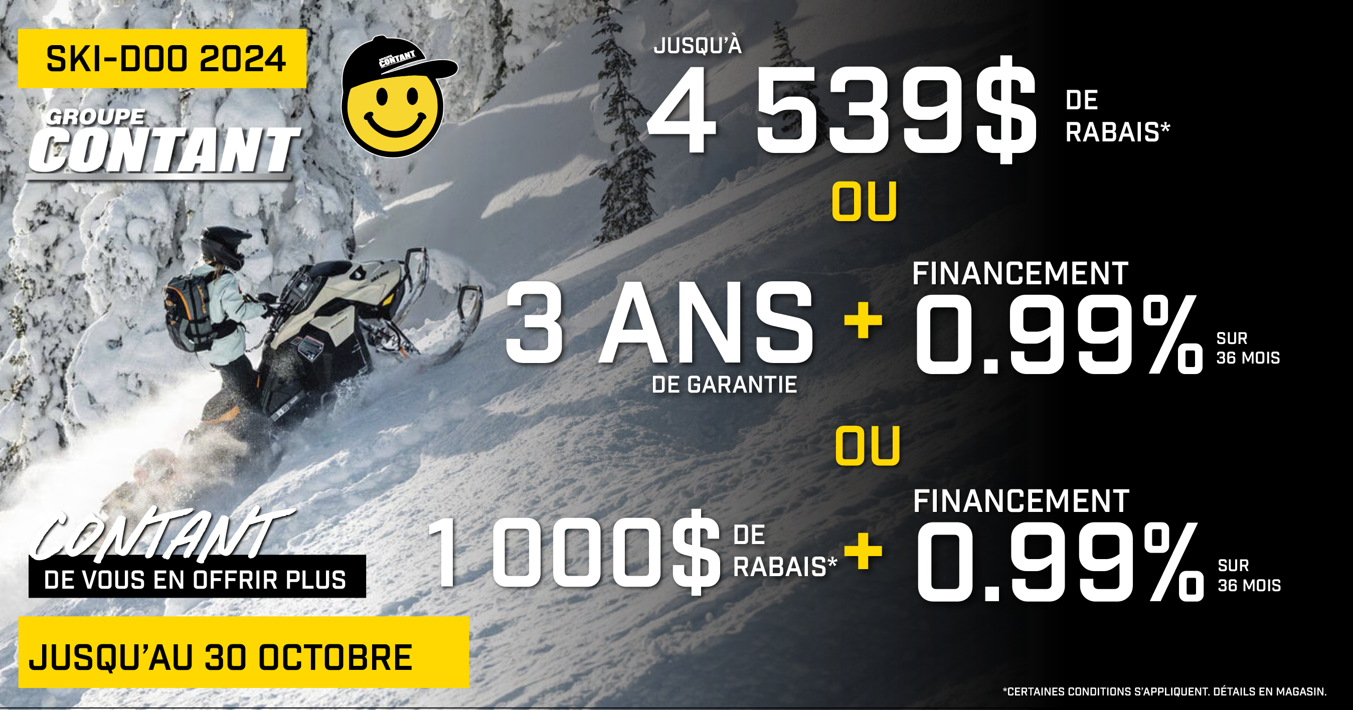 Nous avons un grand inventaire de motoneiges Ski-Doo neuves ou d'occasions! En effet, toute la gamme BRP : Summit, Freeride, Backcountry, Renegade, MXZ, Grand touring, Expedition, Skandic et Tundra sont disponibles chez Contant. Ski-Doo, ce sont les modèles de motoneige les plus fiables et robustes qui vous permettront d'affronter tous les sentiers de motoneige et la poudreuse dont vous rêvez, la gamme SkiDoo est segmentée en fonction du style de conduite et de l'utilisation que vous désirez faire de votre Ski Doo, effectivement, nous en avons pour tous les goûts!